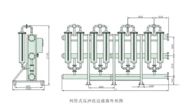 列管式反沖洗過濾器由罐體、濾芯組件、設備就近連接管線、自動閥門、控制柜等組成。在過濾器殼體的內部設置有多根濾管,污液從濾管外面流向濾管內部,然后從過濾器的集液腔流出??刂撇捎脡翰?時間控制(壓差優先),當過濾器進出口的壓差達到設定的壓差極限時,過濾器進入反向沖洗過程。需進行反沖洗的濾管單元中止過濾,進行反沖洗。可供選擇濾芯種類:金屬燒結濾芯、楔形濾芯、絲網濾芯、聚丙烯濾芯、陶瓷濾芯。